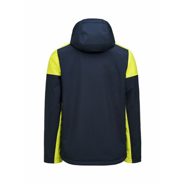 Bicolor softshell jas met afneembare capuchon. Contrasterende ritssluiting vooraan en aan de zijzakken. Aanpasbare mouwen met velcrosluiting. Trekkoorden aan de kap en aan de boord onderaan. Uitscheurbaar neklabel en afzonderlijk geweven maatlabel. Aan de binnenzijde van de linkerzijnaad werd een zakje voorzien voor het innaaien van een waschip. Zippullers in contrasterende kleur. Oeko-Tex 100 gecertificeerd.